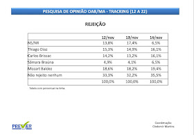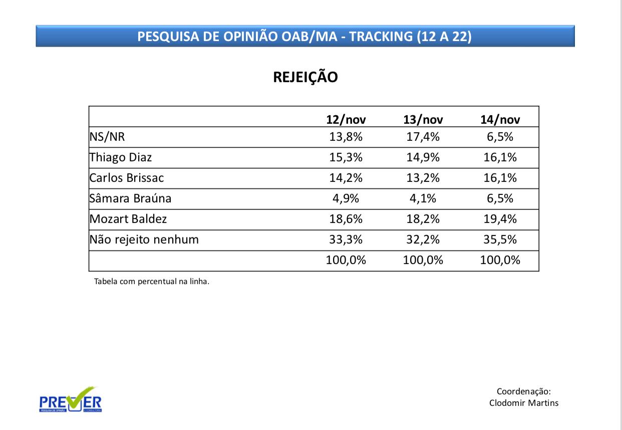 O detalhamento das rejeições entre os eleitores aos principais candidatos que disputam à Presidência da OAB-MA , medidas pela pesquisa tracking do Instituto Prever- voltou a ser motivo de piadas nas redes sociais. Na sexta-feira, 17, o mesmo instituto já havia sido motivo de chacota após divulgar uma sondagem apontando vitória de Thiago Diaz no pleito da entidade com mais de 40%, omitindo os dados sobre rejeição.